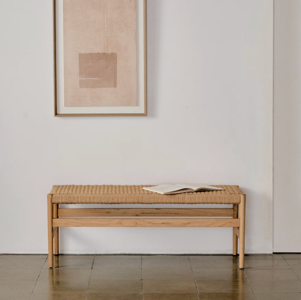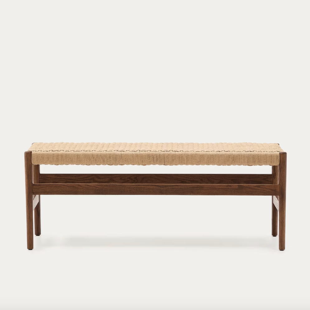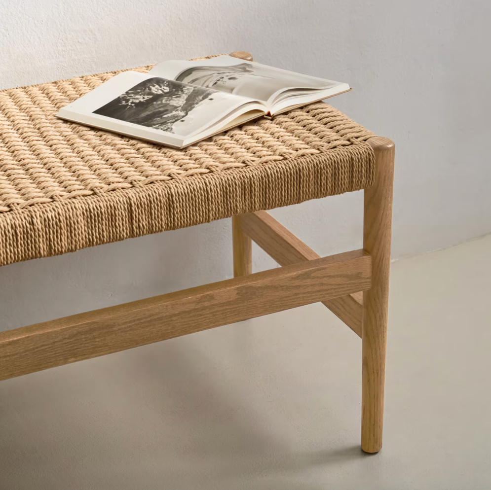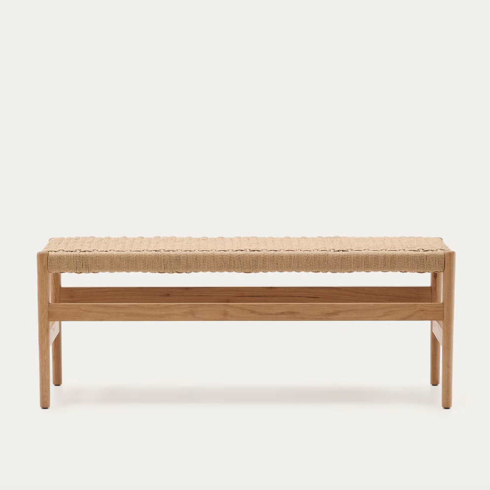 Zitbank is ambachtelijk ontworpen met een structuur van massief eikenhout en een handgevlochten zitting van papiertouw. Hij is zo mooi afgewerkt dat het lijkt alsof je de natuur in huis haalt. Bankje van massief eikenhout met een walnoot afwerking. Gemaakt met natuurlijke materialen waardoor elk bankje unieke tinten en nerven...