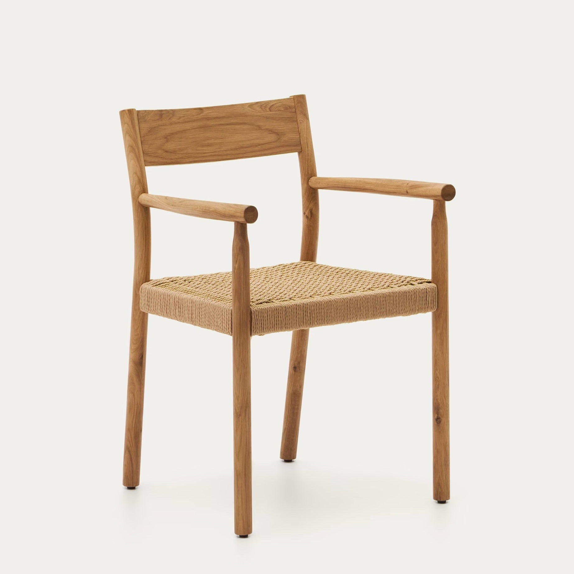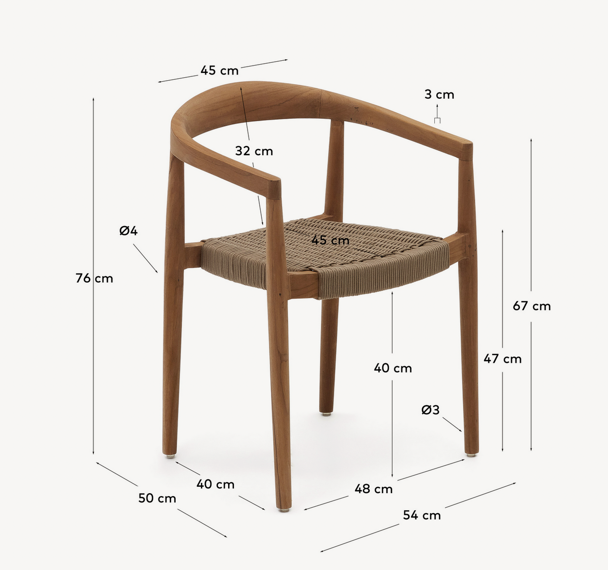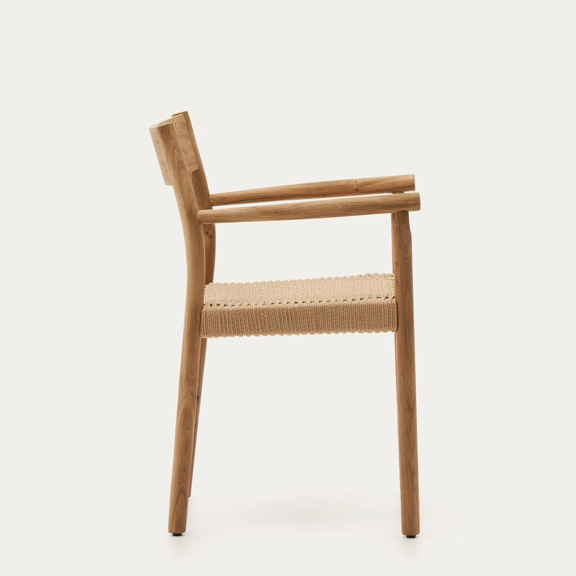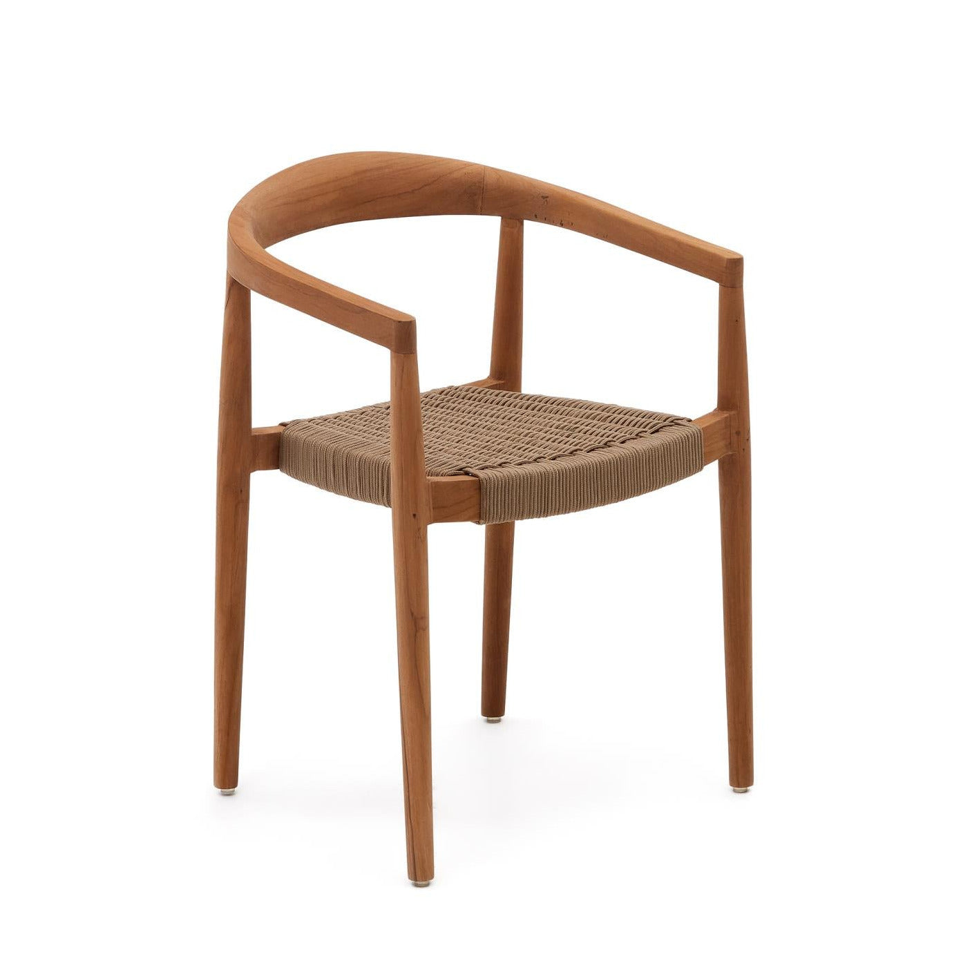 Elegante stapelbare stoel in massief teakhout met natuurlijke afwerking en beige touw Stapelbare stoel met armleuningen van natuurlijke materialen. Massief teakhouten structuur met natuurlijke afwerking en unieke nerven op elk stuk. Zitting gemaakt van handgeweven, UV-bestendig touw. Het hout komt uit duurzame bossen en gecontroleerde houtkap. Geschikt voor binnen en...