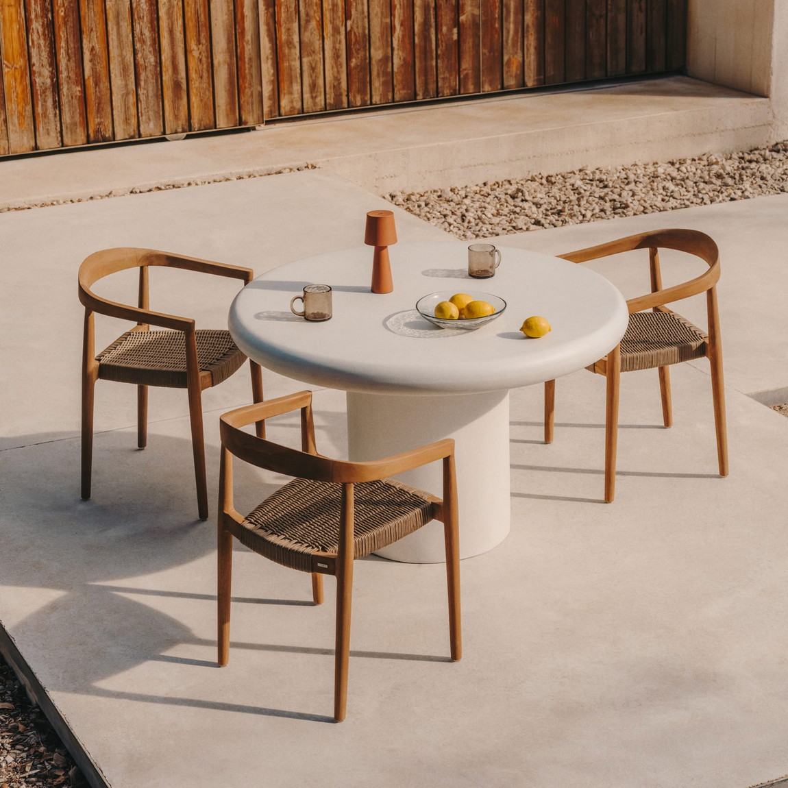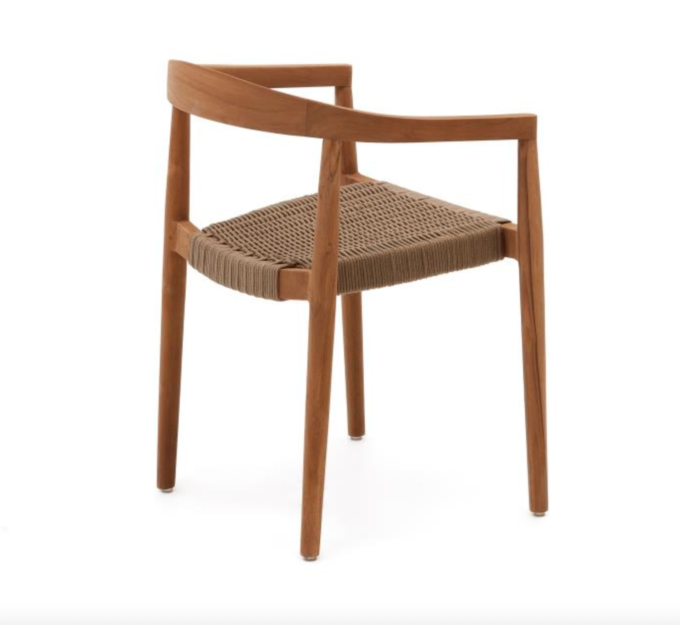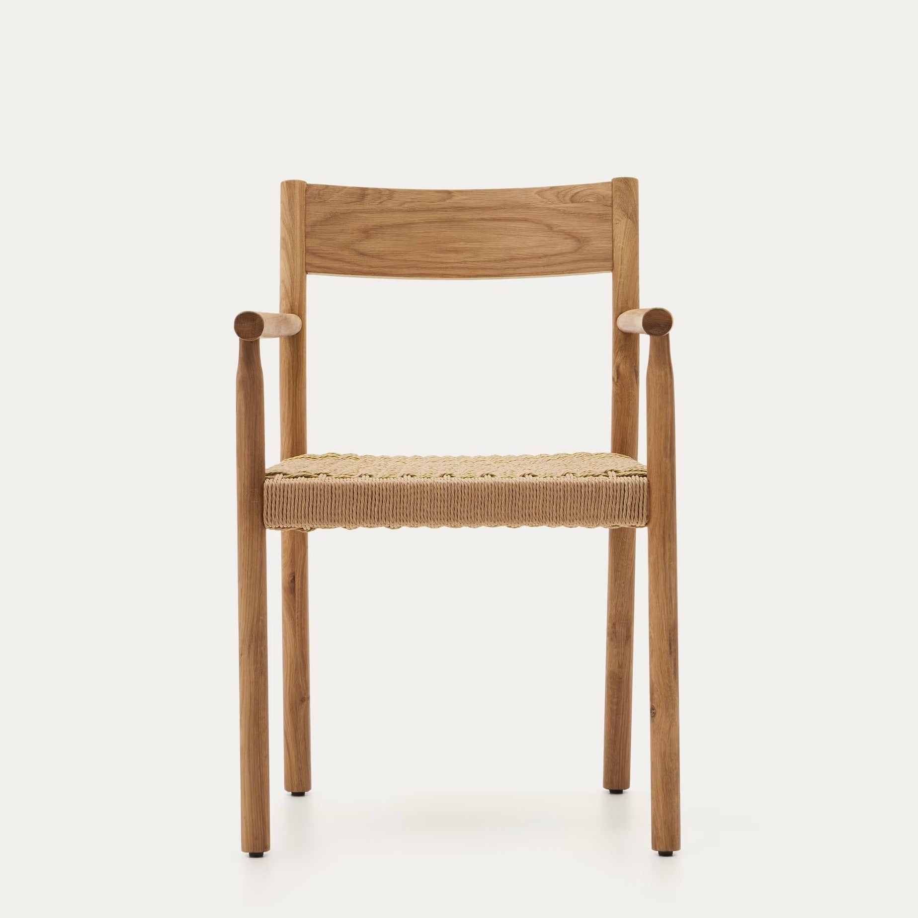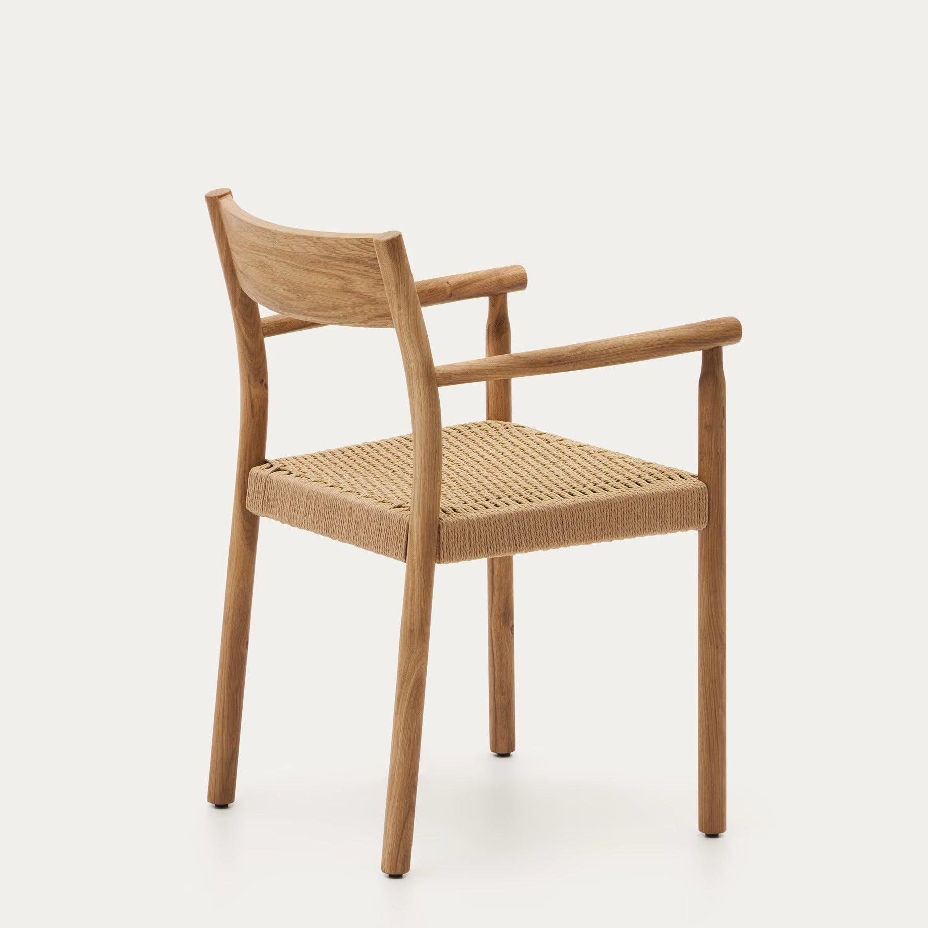 Elegante stapelbare stoel in massief teakhout met natuurlijke afwerking en beige touw Stapelbare stoel met armleuningen van natuurlijke materialen. Massief teakhouten structuur met natuurlijke afwerking en unieke nerven op elk stuk. Zitting gemaakt van handgeweven, UV-bestendig touw. Het hout komt uit duurzame bossen en gecontroleerde houtkap. Geschikt voor binnen en...
