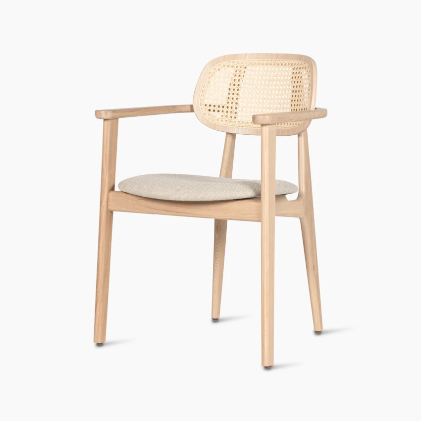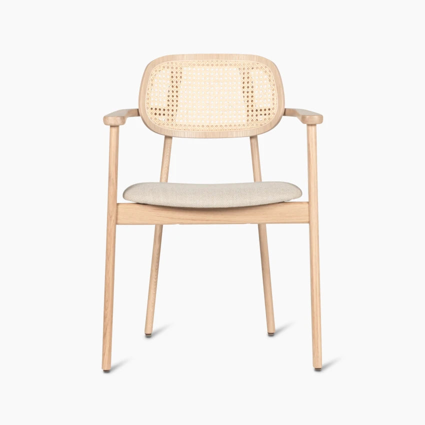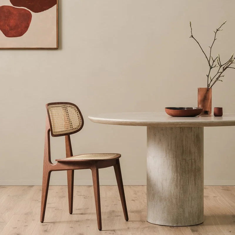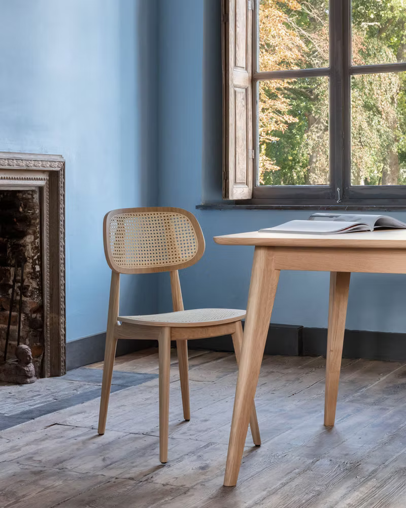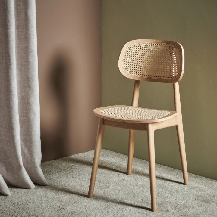 Een verfijnde eetkamerstoel met prachtig geweven canage, een beuken frame en zacht zitje. De Titus stoel voegt een design statement toe aan ieder interieur. Afmetingen: hoogte: 84 cm - breedte: 44 cm - diepte: 51 cm Materiaal : stof / Beuk / canage