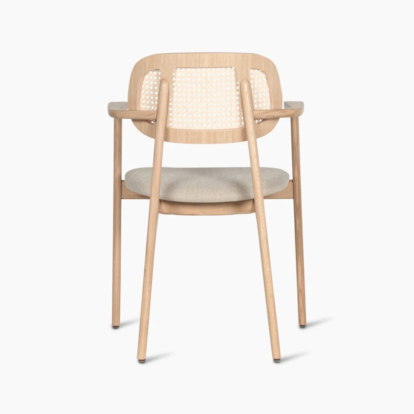 Een verfijnde eetkamerstoel met prachtig geweven canage, een eiken frame en zacht zitje. De Titus stoel voegt een design statement toe aan ieder interieur. Afmetingen: hoogte: 84 cm - breedte: 58 cm - diepte: 54 cm Materiaal : stof / Eik / canage Stof: Verschillende stoffen en kleuren mogelijk. Contacteer ons...