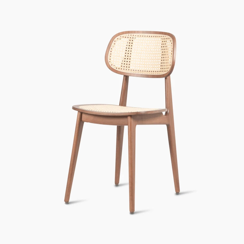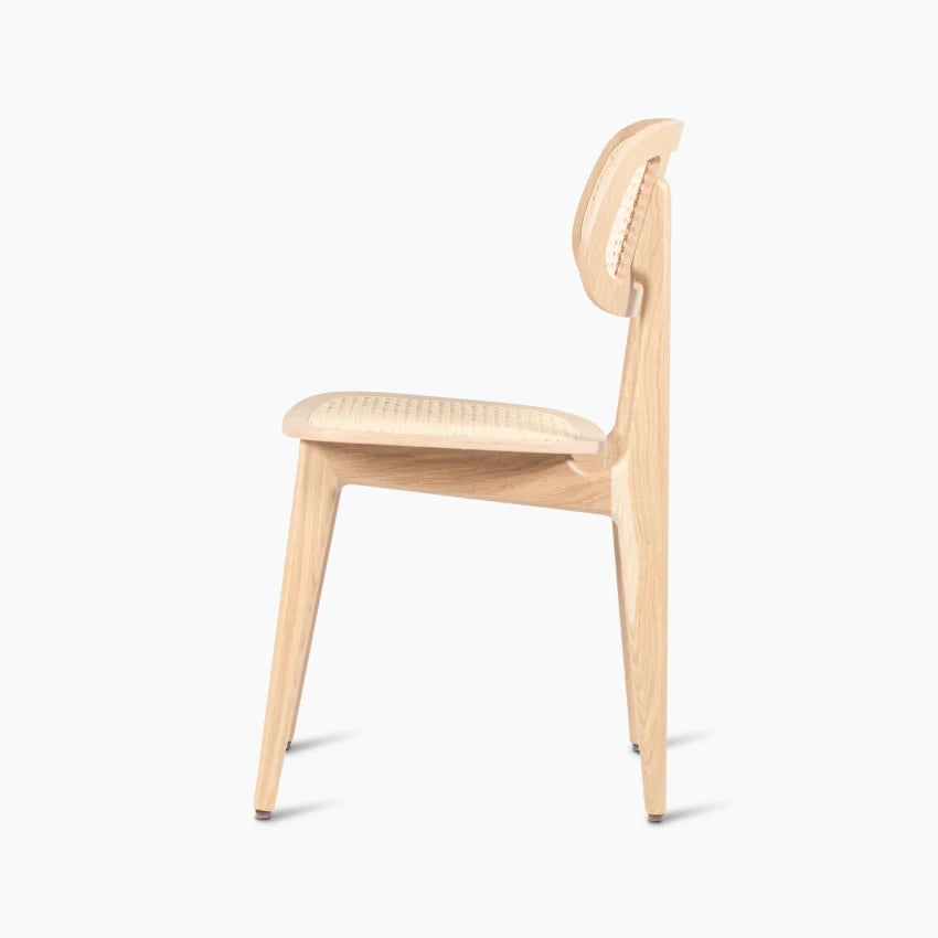 Een verfijnde eetkamerstoel met prachtig geweven canage en een houten frame. Afmetingen: hoogte: 84 cm - breedte: 44 cm - diepte: 51 cm Materiaal : Beuk / canage Cannage zitting en ruggensteun van beukenfineer met frame van massief beuk.