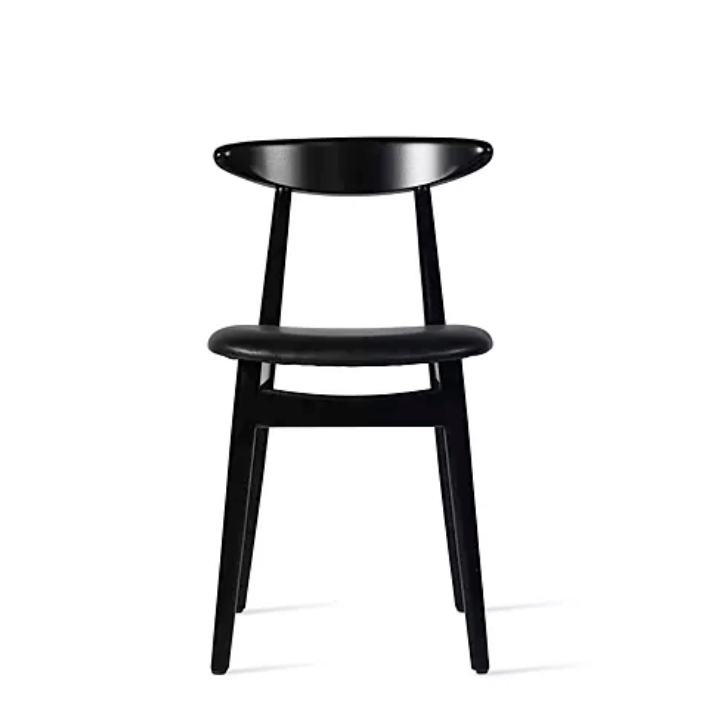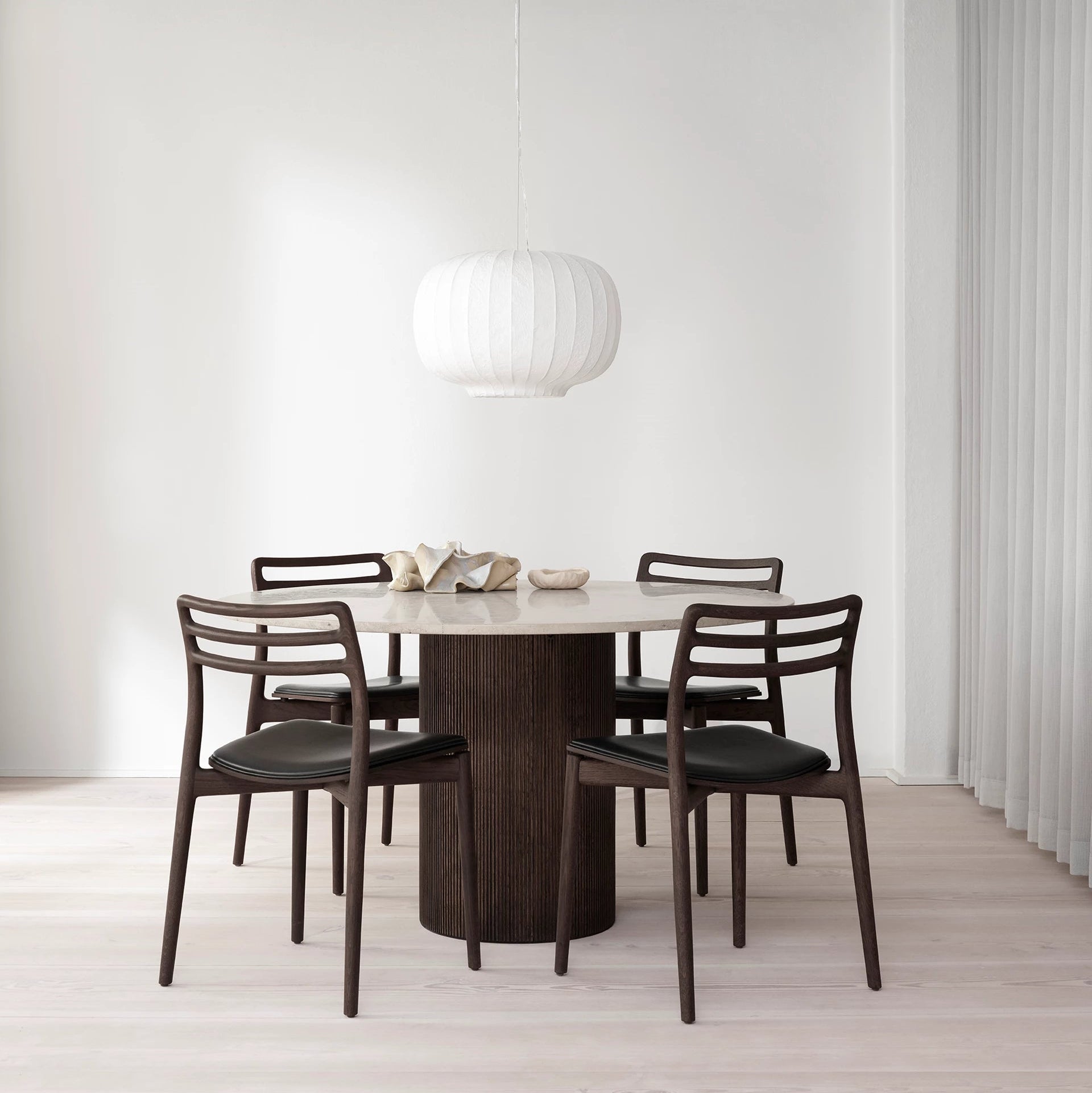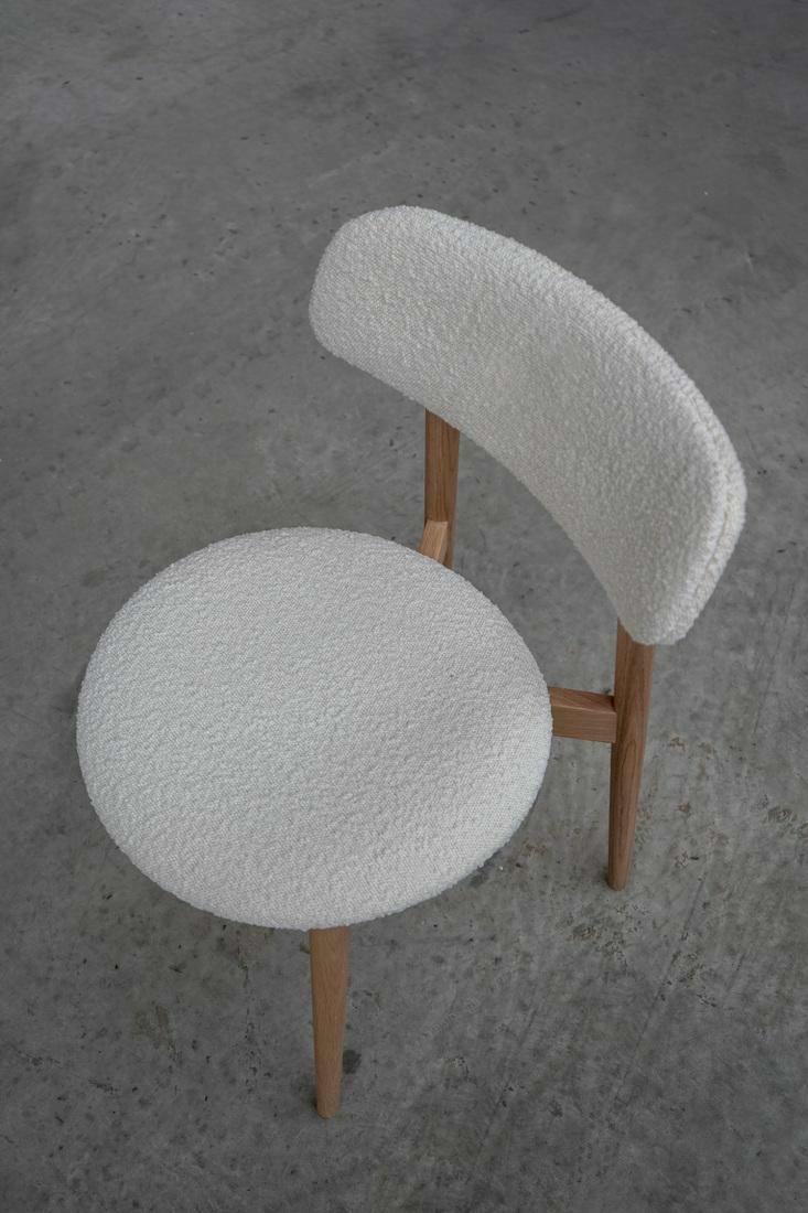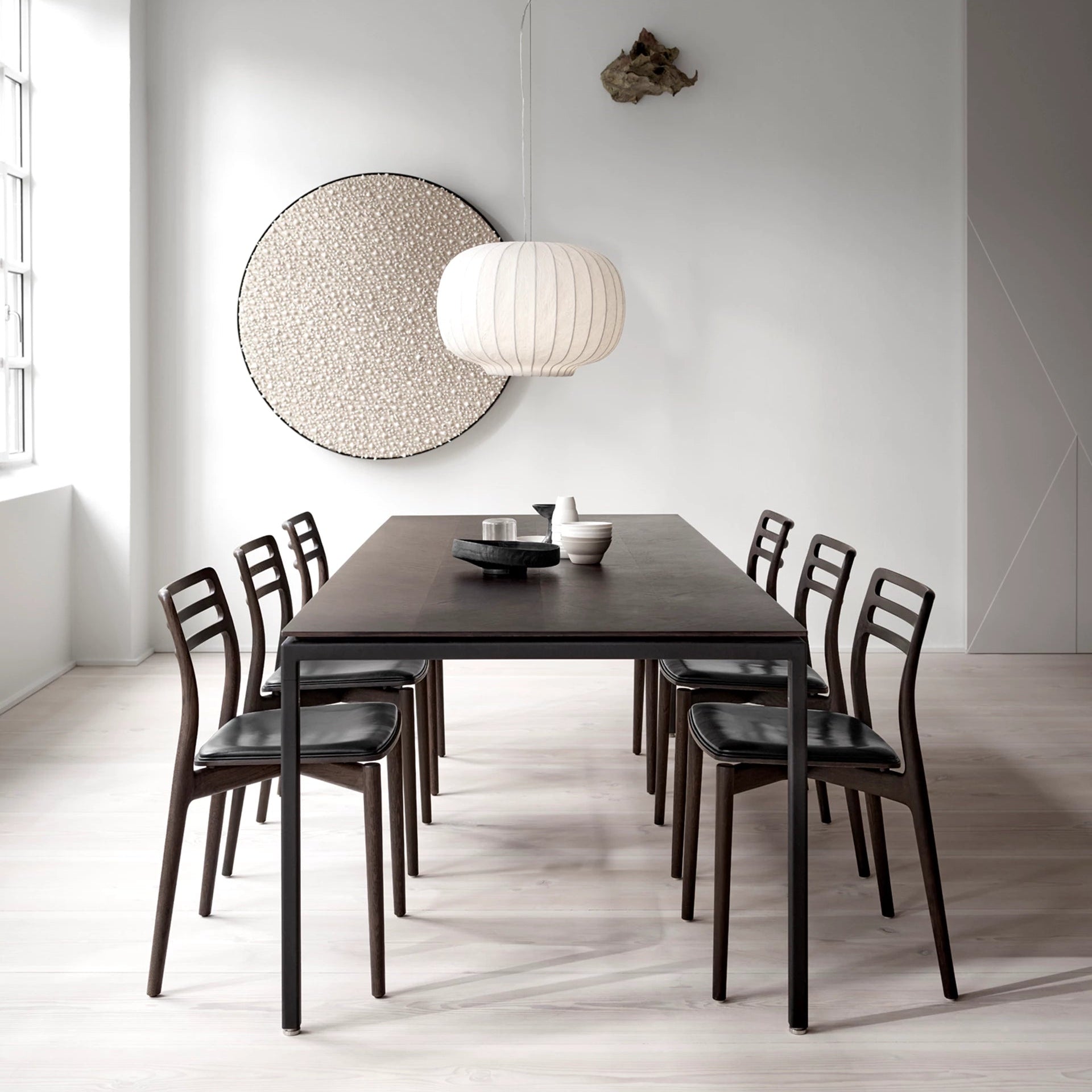 The teo dining chair with fixed padded seat offers next to pure lines and beautifully crafted wood exceptional seating comfort. Brand: Vincent Sheppard Material: Beech Upholstery: Vegan Leather Black Vegan Leather Chestnut Bouclé fabric White Bouclé fabric black Custom fabric possible Colour: beech nearly black Measurements: H 78 cm ...