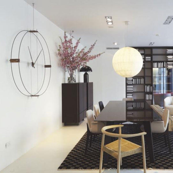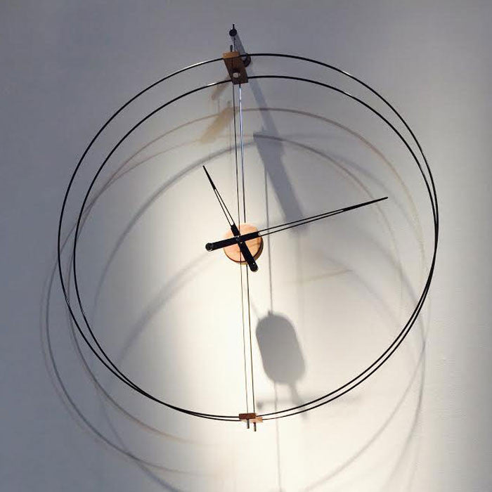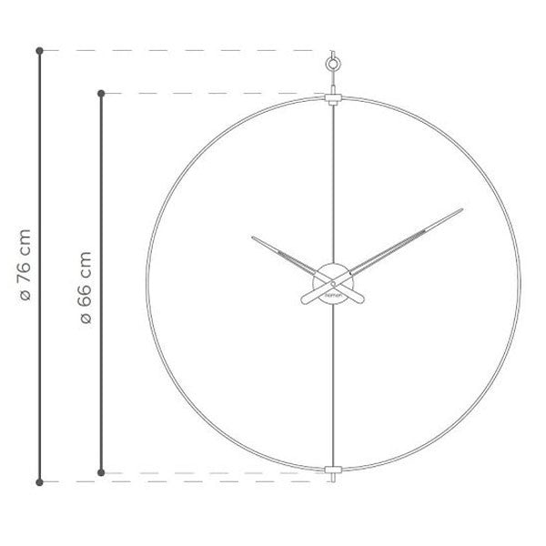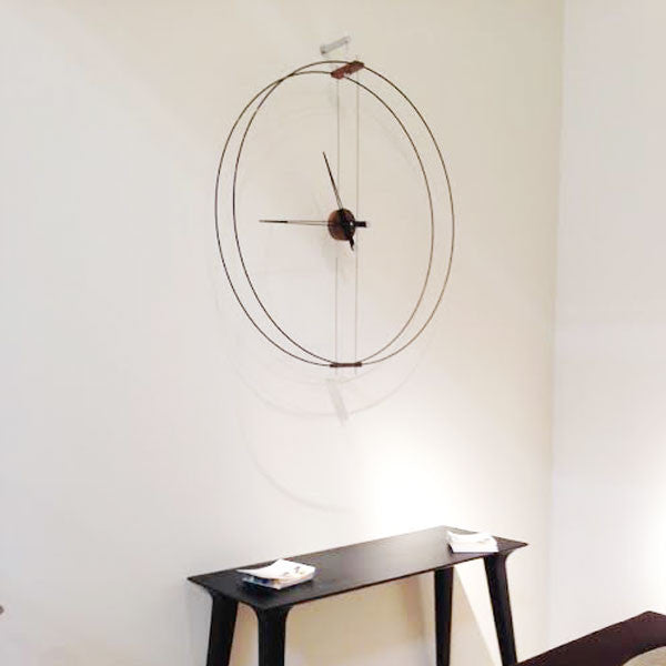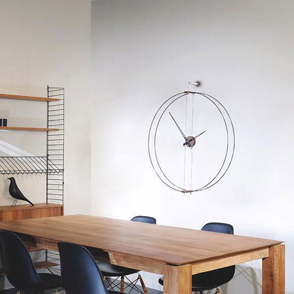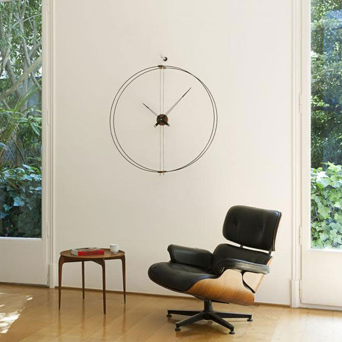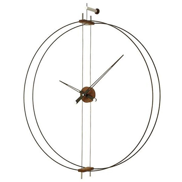 Barcelona Nomon large wall clock, a design clock with two large rings and hands in natural walnut. Brand: Nomon Colour: Black & walnut Delivery: 2 weeks Measurements: Ø 66 cm / H 76 cm Material: Box: natural walnut Hands: black lacquer Fiber ring: black