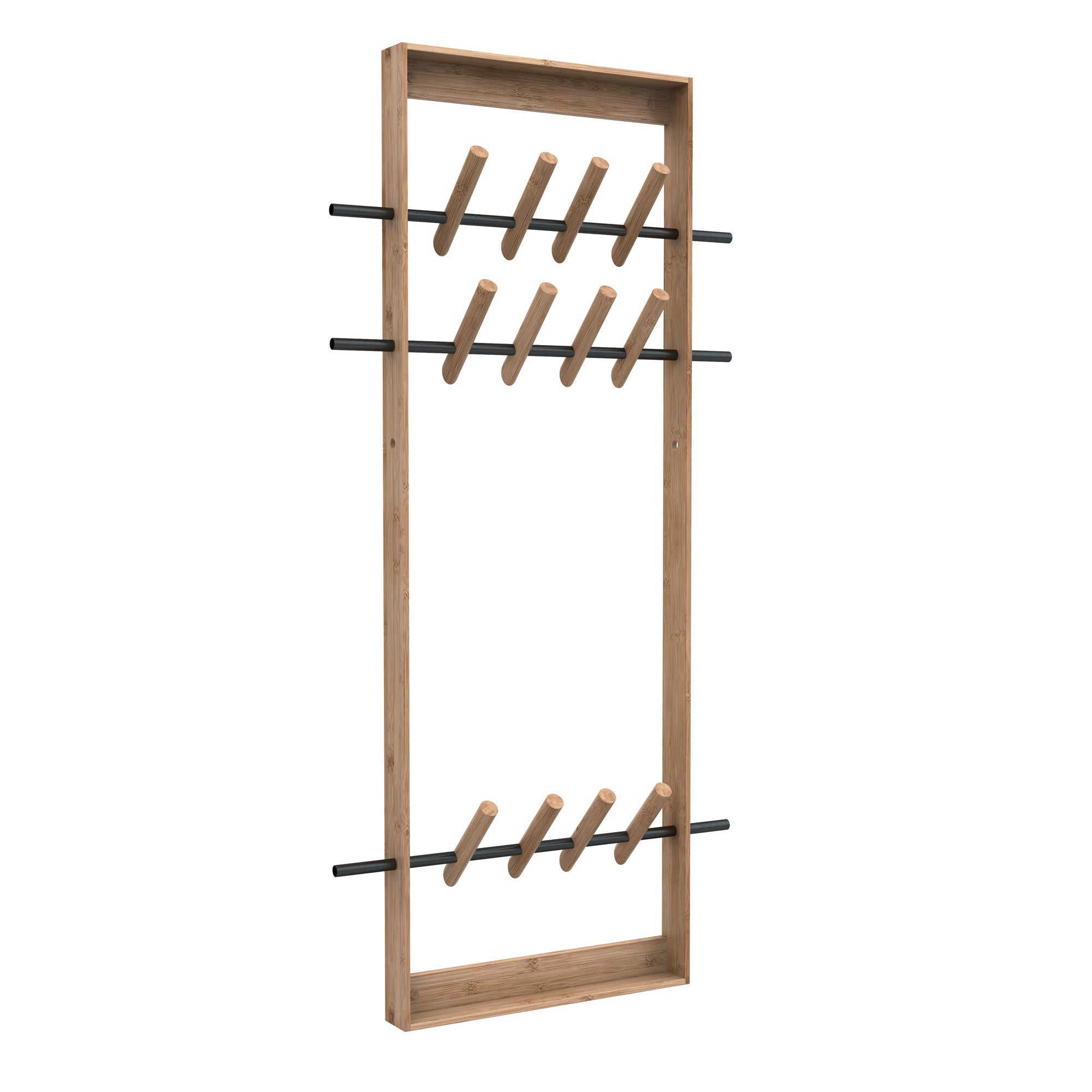Coat Frame bestaat uit drie verstelbare kapstokken, die zijn gemonteerd in een frame van bamboe. De jashaken zijn bevestigd op drie metalen stangen en kunnen zowel zijwaarts als in hoogte worden versteld. Het bamboe frame dient zowel als montagesysteem als een prachtig visueel kader voor jassen, sjaals en meer....