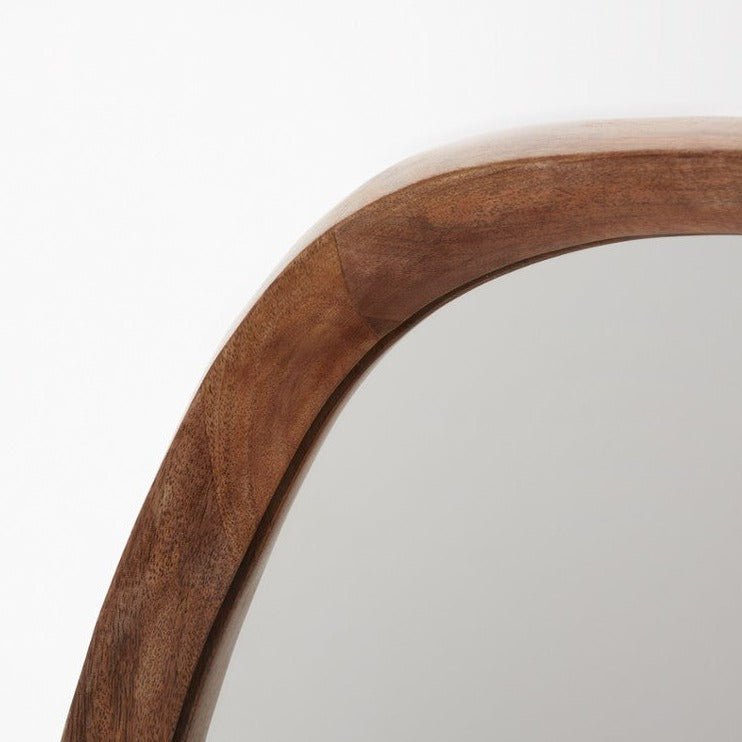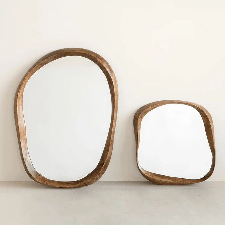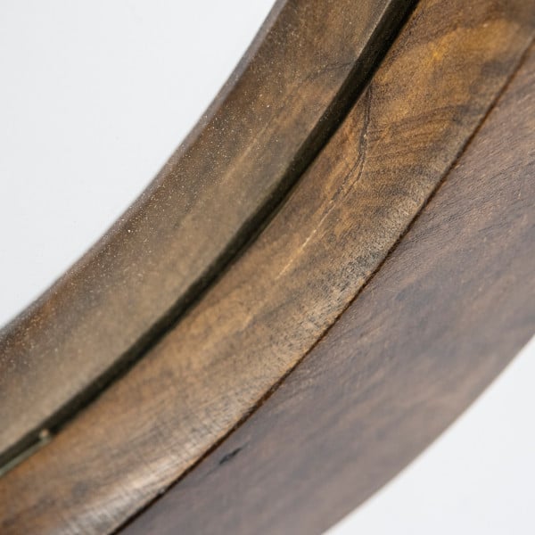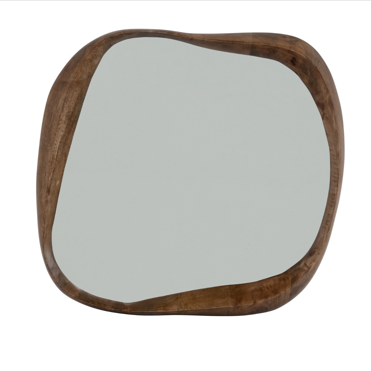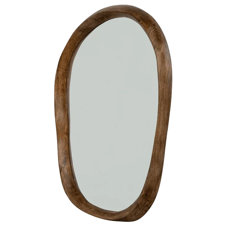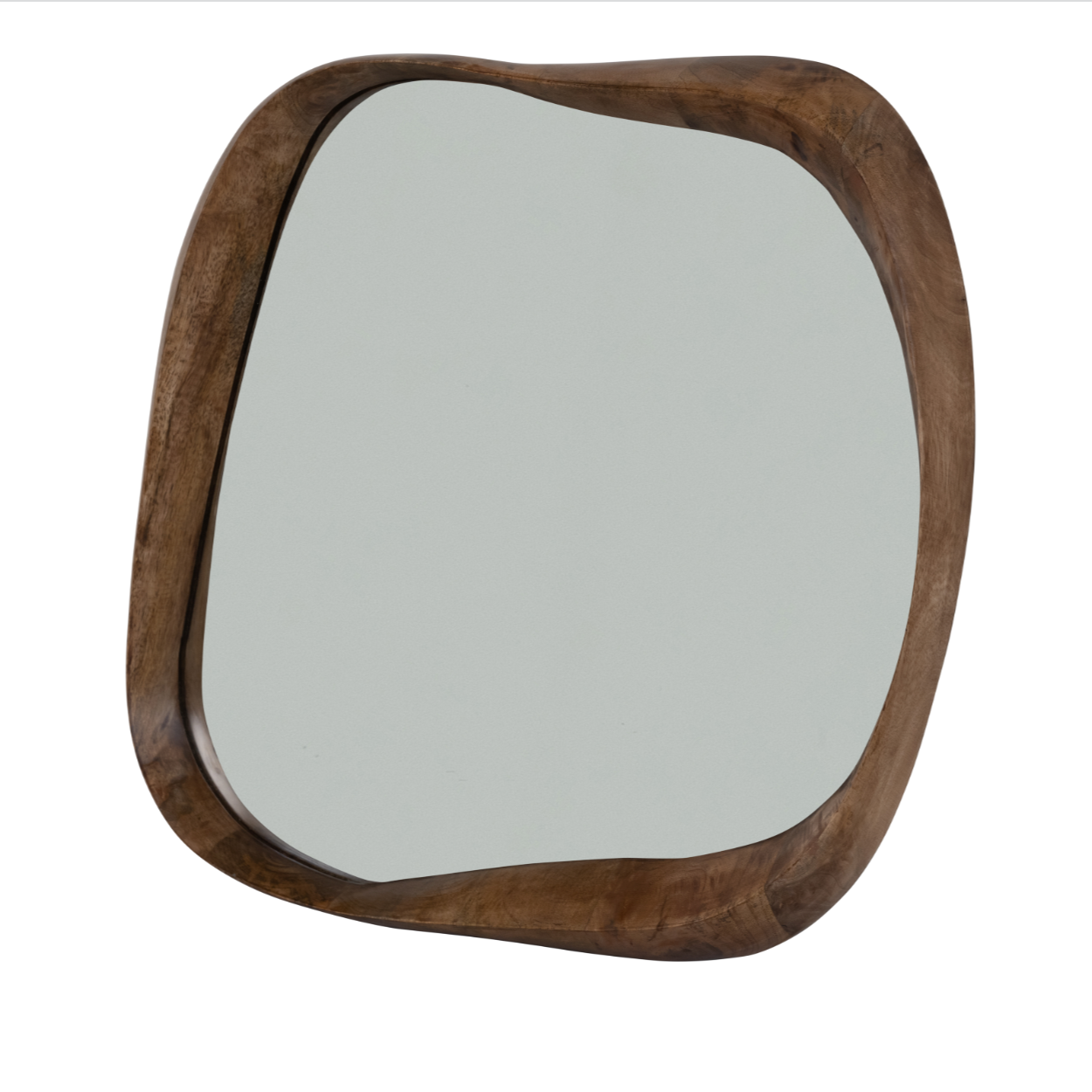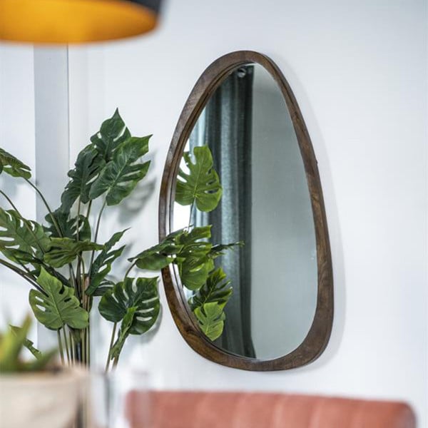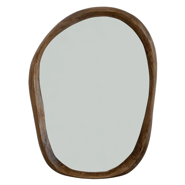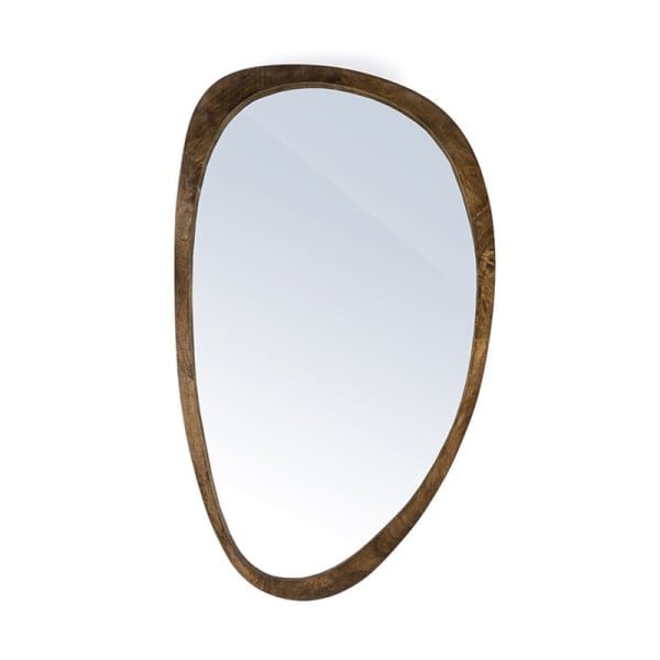 De organische spiegel heeft een natuurlijke uitstraling dankzij de houten rand in een asymmetrische vorm. Hang de houten spiegel verticaal in de hal of horizontaal boven de bank. Afmetingen: Breedte: 70 cm - Diepte: 5 cm -Hoogte: 120 cm Materiaal: donker bruin mangohout