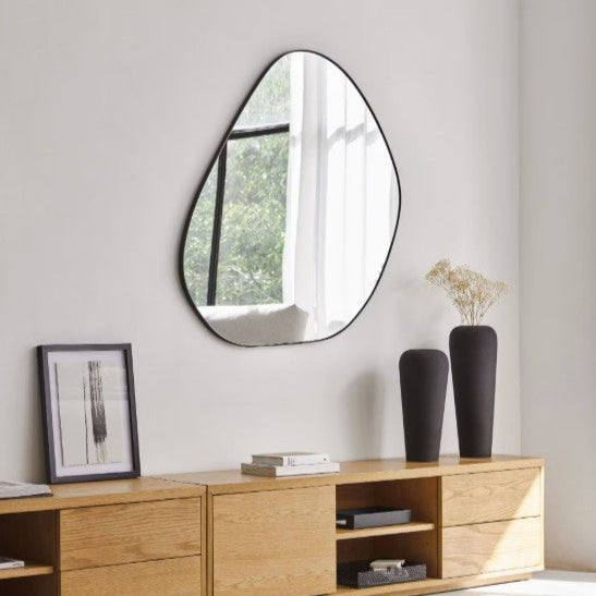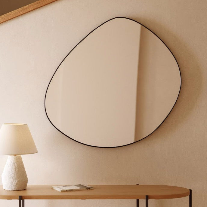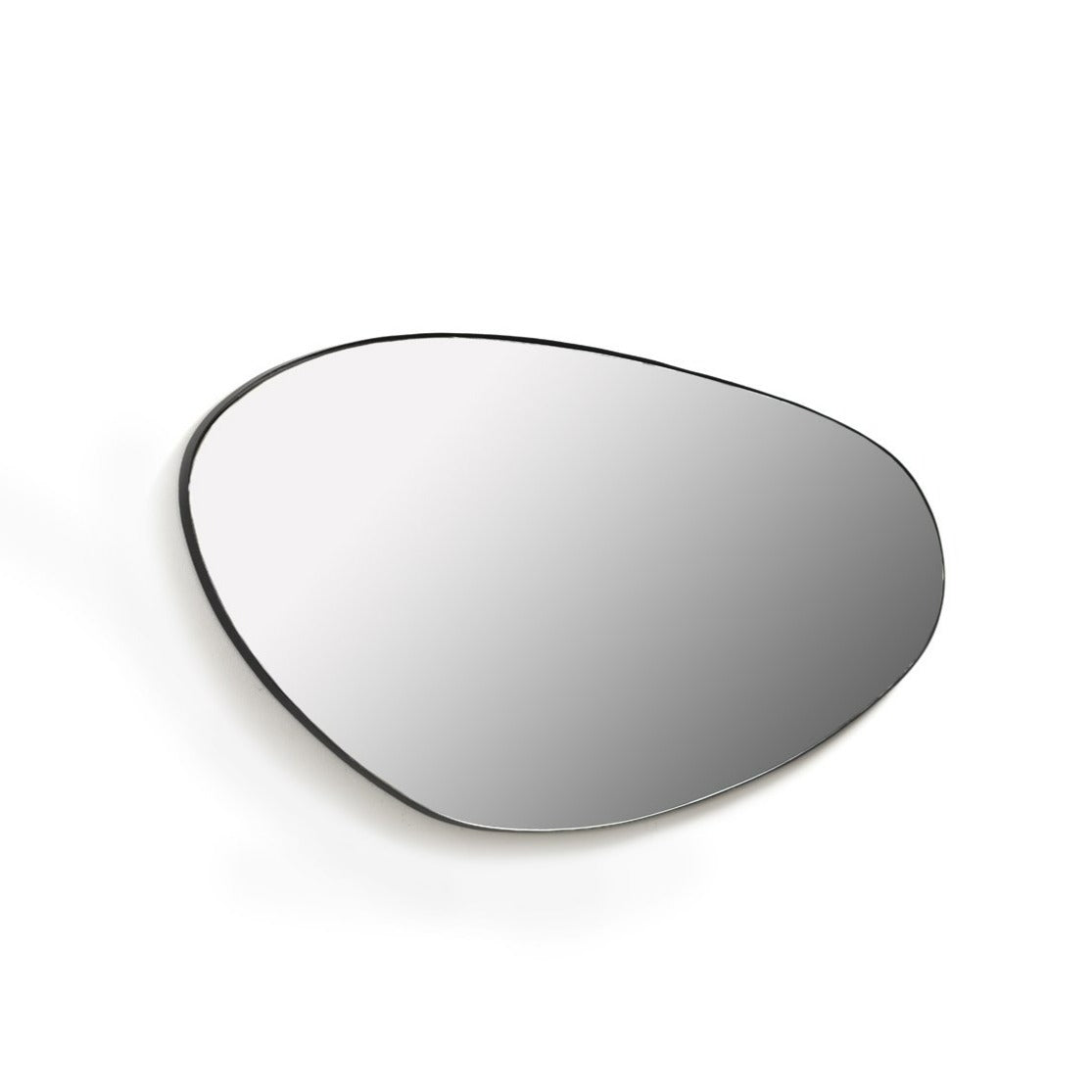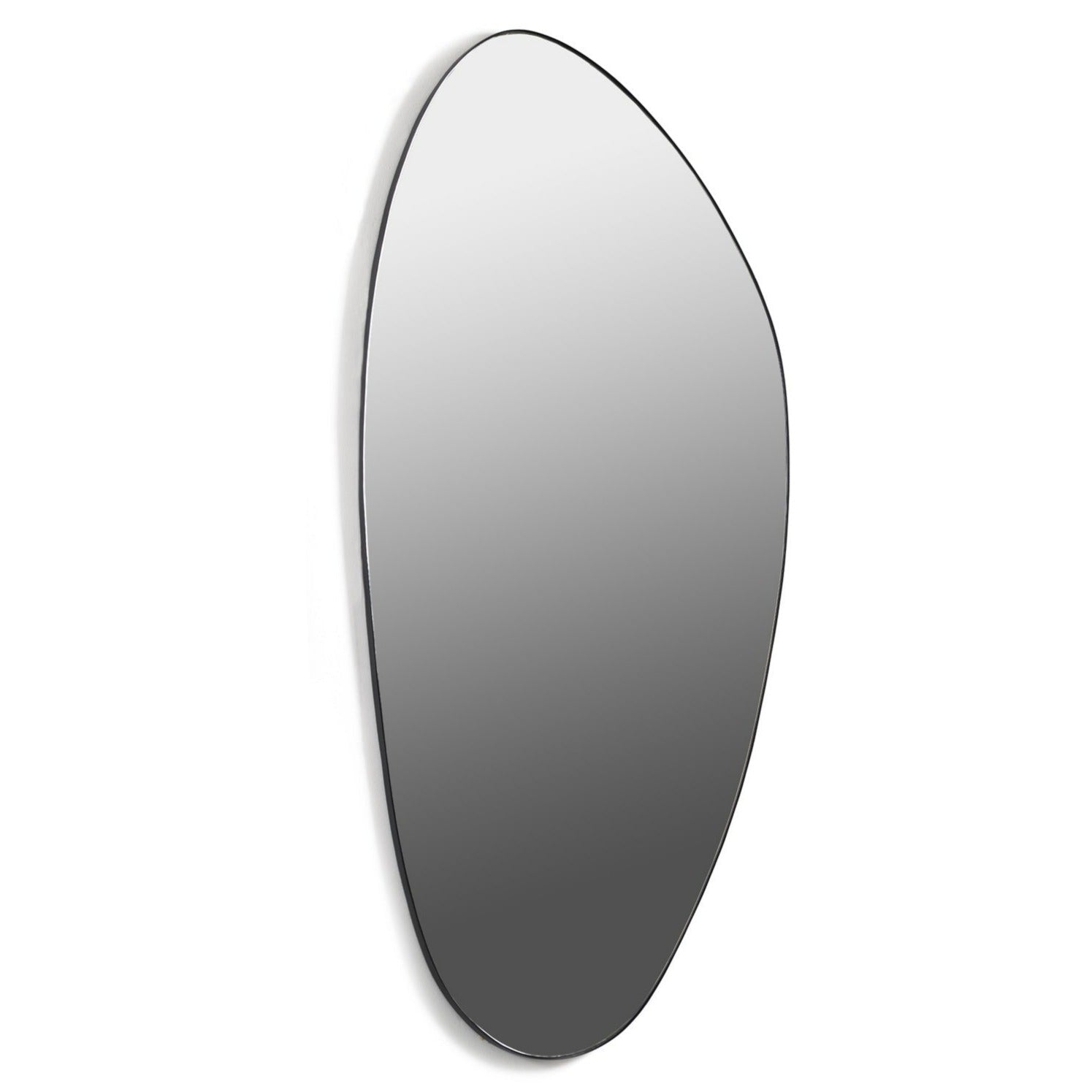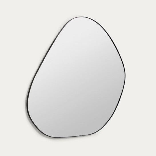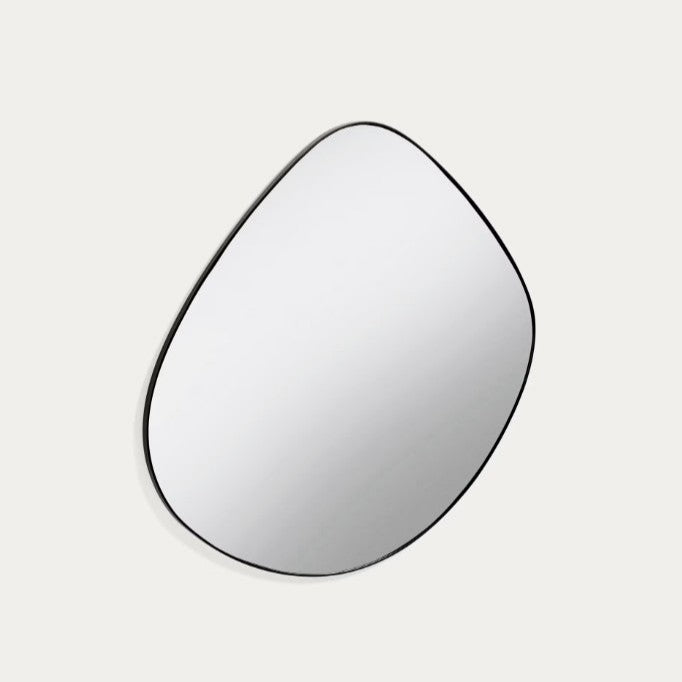 Volmaakt imperfect. Deze asymmetrische spiegel is een ambachtelijk stuk. Sommigen zien een steen uit de rivier, anderen een waterdruppel, maar hoe dan ook, dit is een spiegel met een unieke stijl voor ruimtes met karakter. Materiaal: zwart staal Afmetingen: W: 95 x H: 108,5 x D: 2 cm