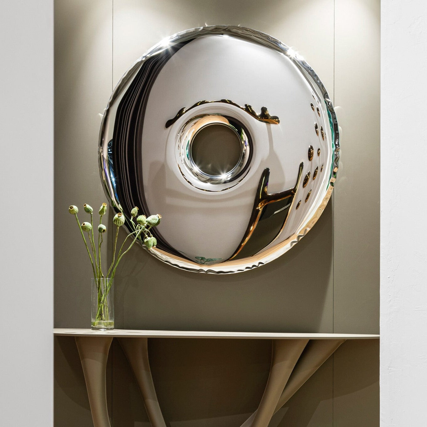 TAFLA O is een serie bionische spiegels met organische vormen, geïnspireerd op de natuurlijke vormen van vloeibare druppels. De spiegels uit de TAFLA-collectie zijn gemaakt van hoogglans gepolijst roestvrij staal. Het gladde, maar gekreukte oppervlak is gemaakt van hoogglanzend roestvrij staal. Materiaal: INOXAfmetingen: H: 123 x B: 64 x D: 6 cmBeschikbaarheid: 2 -...