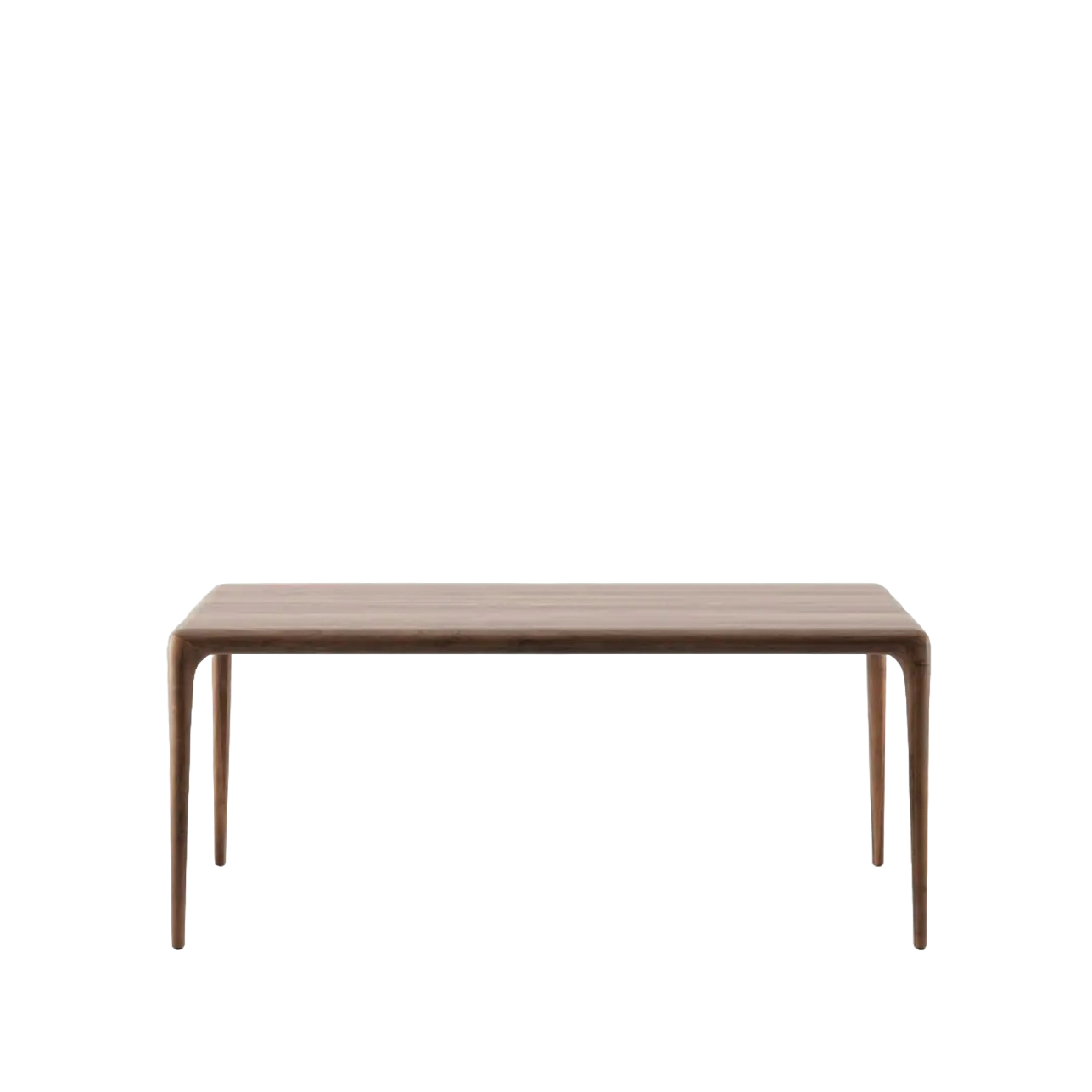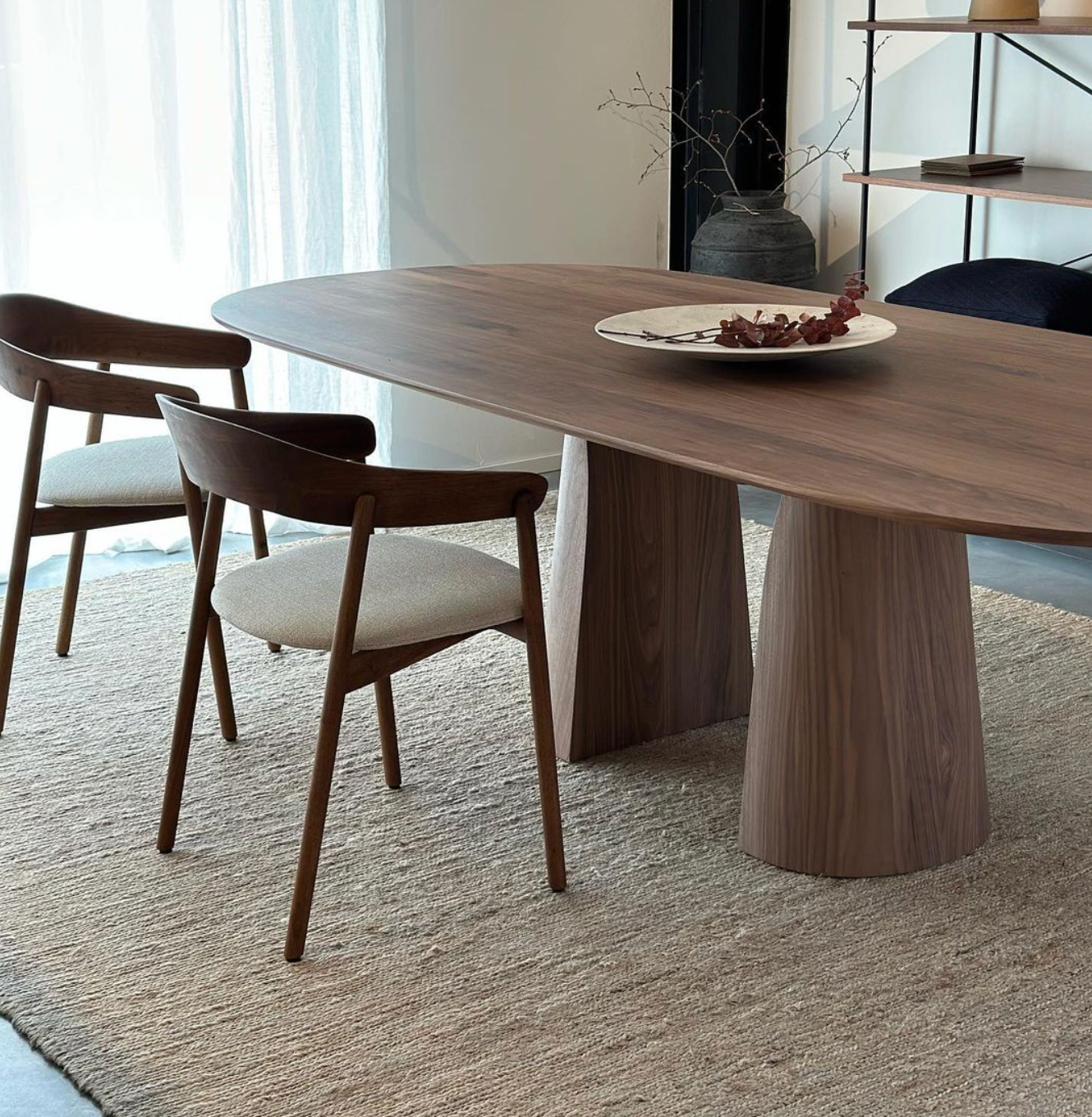 licht en slank design, afgeronde hoeken en een blad van massief hout. Deze tafel zorgt voor een cachet in de leefruimte. De stevige poten staan in het midden van de tafel zodat meer mensen bij elkaar kunnen zitten zonder elkaar te hinderen. Materiaal: WalnootAfmetingen: 115x140cm 135x160cm 135x180cm 105x160cm 105x180cm 105x200cm...