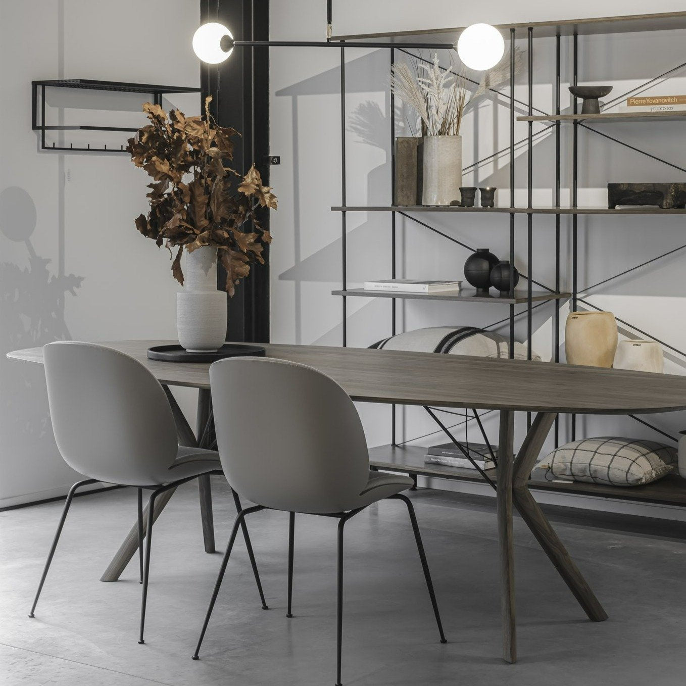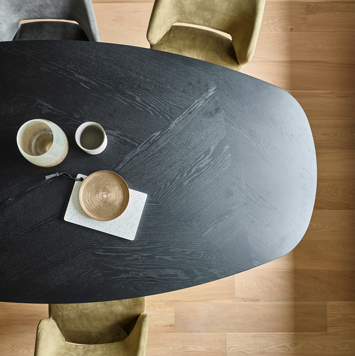 Confidently drawn curves and lines. Mixed wood and metal feet with unstructured lines. A surprisingly refined table top. The Élipse table is the embodiment of a desire for lightness. 24mm multiplex base, black chamfered edges, topveneer 0.6mm in blackend oak, «MOSAIC» finish. Material: oak Delivery: 6 - 8 weeksMeasurements: 100x180cm 100x200cm 110x220cm...
